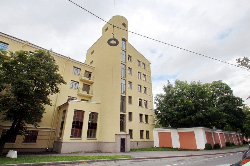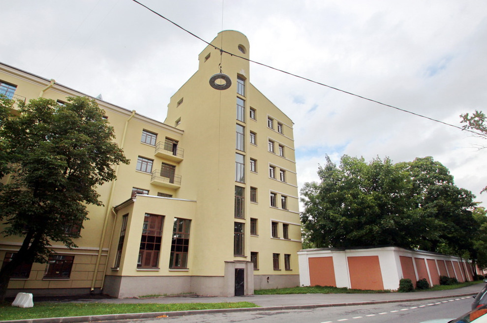Пятиэтажный дом в стиле конструктивизма был построен в 1937 году. Его выделяют шестиэтажная башня у канала имени Петра Великого и высокая тройная арка. В российское время здание признали аварийным и расселили. Несколько лет оно стояло заброшенным.