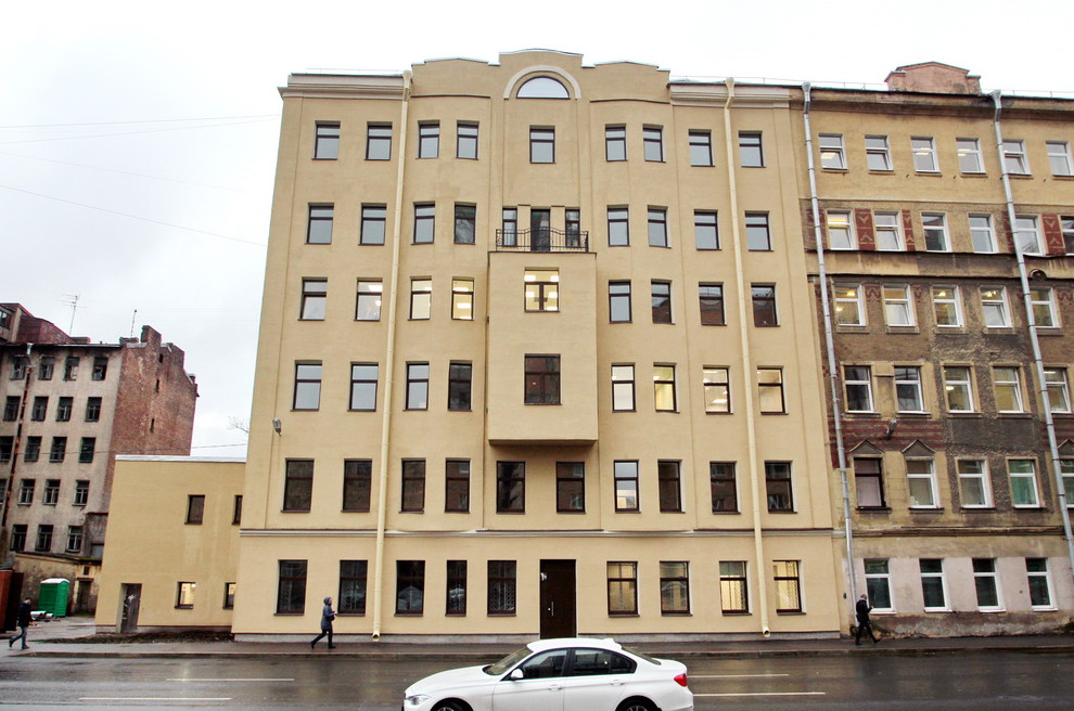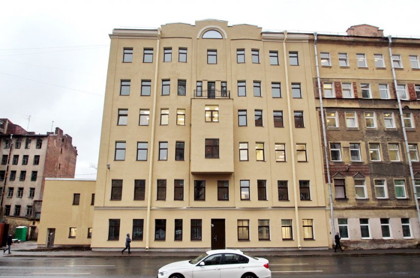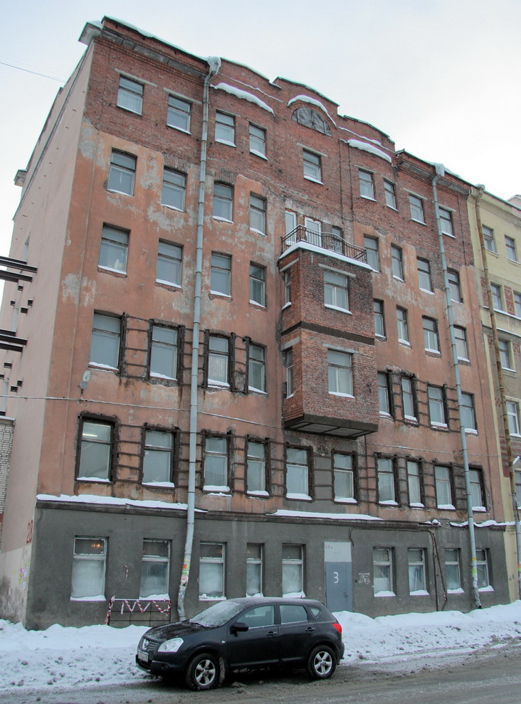 Пятиэтажный доходный дом был построен в 1912 году по проекту Леонида Котова. В 1980-х его надстроили дополнительным этажом, при этом оштукатурить его так и не успели. Тогда же, вероятно, появился двухэтажный эркер посередине фасада — тоже неоштукатуренный.