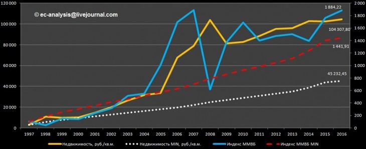 Что это означает? Так то, что цены на недвижимость растут со скоростью самой инфляции на долгосрочном промежутке. Когда-то цены взлетают, когда-то падают, но рост цен укладывается в инфляцию. Поэтому на графике цен я решил добавил еще по одной линии, так называемой минимальной линии. Как она получается? Я взял значения на конец 1997 года по стоимости квадратного метра и индекса и индексировал их на официальную инфляцию. Т.е. минимальные цены – это цены, приведенные к 1997 году!