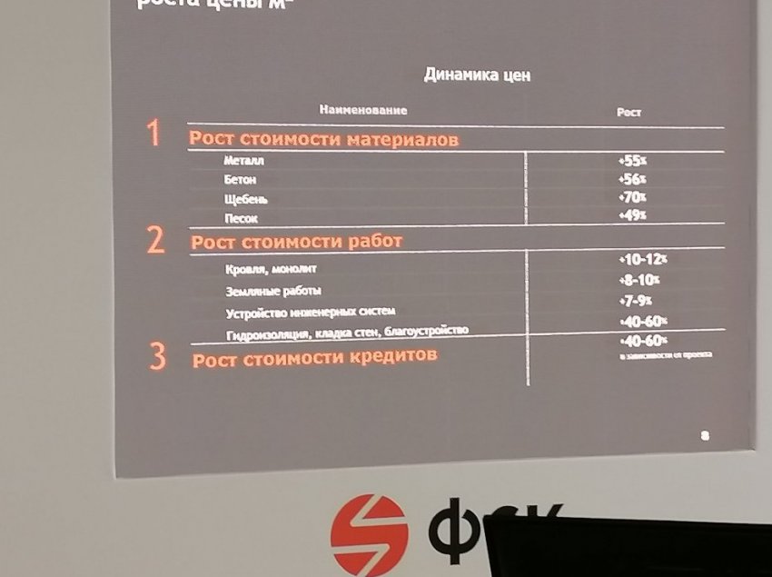 Причины роста квадратного метра топ-менеджер компании тоже скрывать не стал, вспомнив о росте стоимости металла (подорожали инженерные коммуникации, лифты, запорная арматура – в среднем, на 55%), щебня, песка (цена выросла на 50-70%). Увеличились расходы на заработную плату (на 20%).