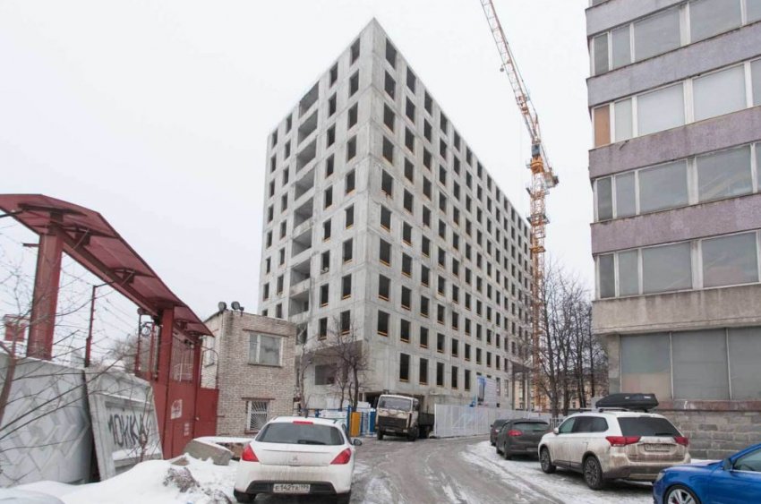 Из 19 этажей в доме уже возведено около десяти, но посмотреть объект мы можем только издалека: как отметила менеджер, поскольку идут строительные работы, осмотр дома и посещение строительной площадки запрещены.