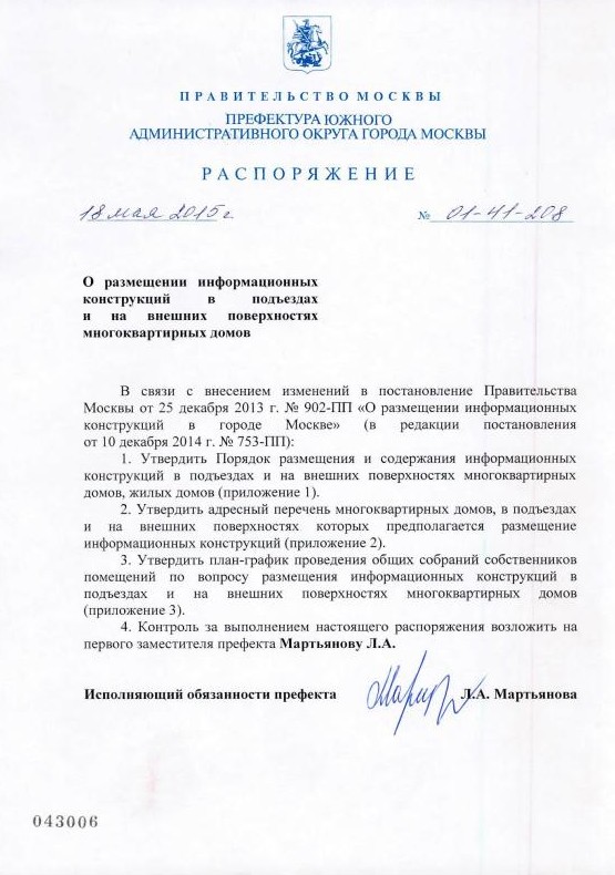 В ходе исполнения контрактов Префектуры наткнулись на противодействие граждан, которые начали писать жалобы на незаконно использование принадлежащего им общедомового имущества. Тема с информационными щитами не очень пролезала - народ давно не верит чиновникам. Пришлось озаботиться легализацией, для чего Префектура, например, Южного округа, издала замечательные Распоряжение: