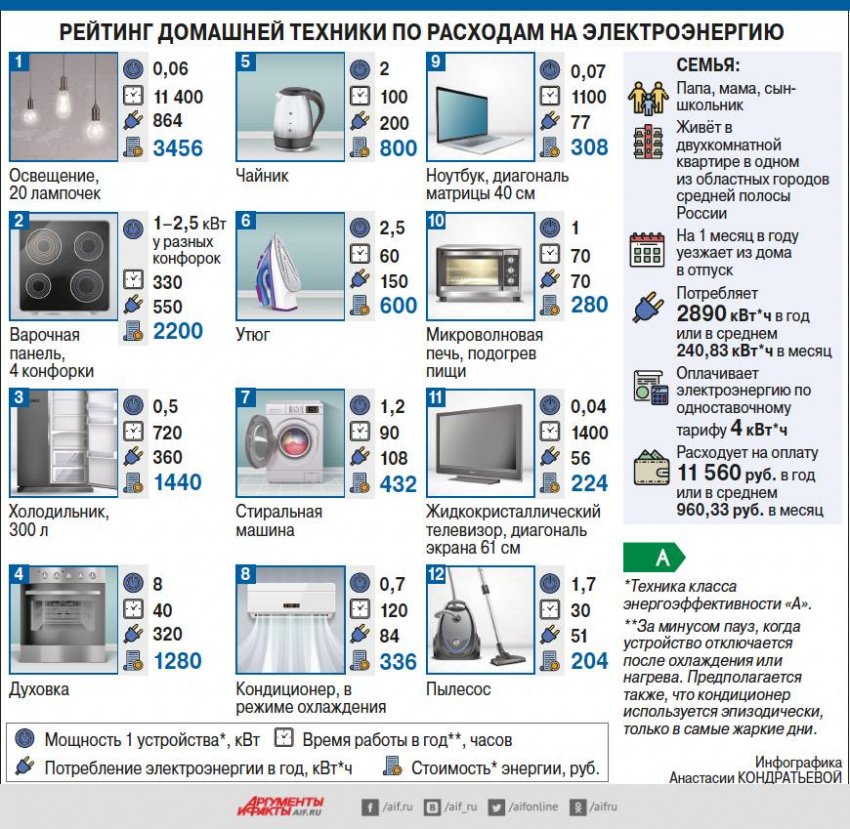 В рейтинге, составленном «АиФ» для условной российской семьи и квартиры, расходы на освещение занимают первое место. На втором – варочная панель, а холодильник – только на третьем. На эти электроприборы стоит обратить главное внимание, чтобы заметно сэкономить на электроэнергии.