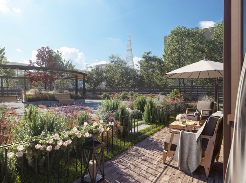 Отдельное внимание, по традиции, уделено благоустройству. Во дворе дома, по замыслу архитекторов, сквозь округлый проем будет прорастать краснолистное дерево. Оригинальную концепцию дополнят два небольших сада, ландшафт которых спроектирован командой MAD Architects.