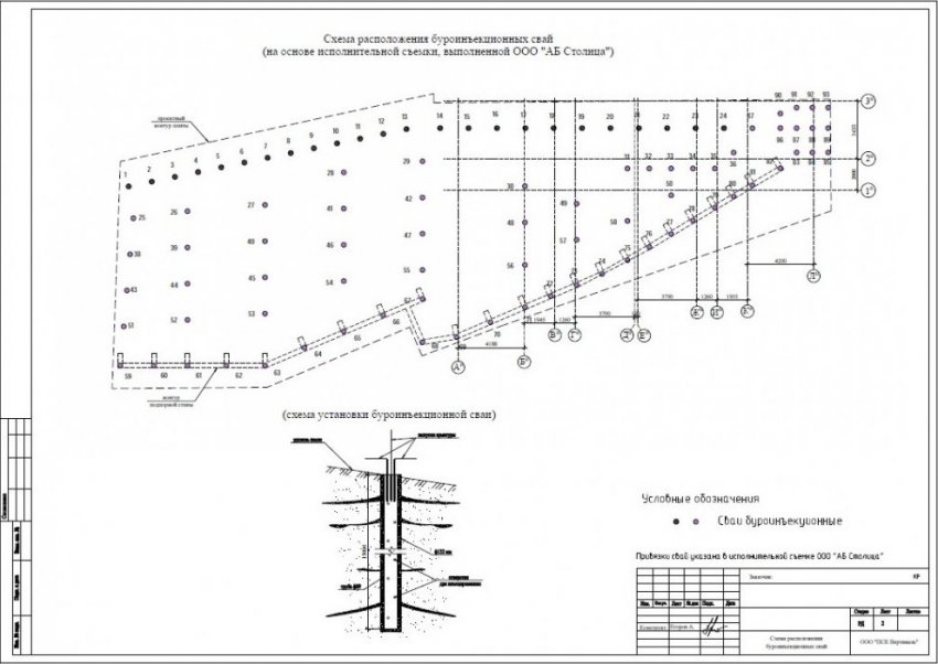 Все эти мероприятия, в силу выявленных деформаций склона и конструкций дома, на экспертном совете признали недостаточными. Было принято решение: через тело ростверка, с заранее расположенными в нем закладными трубами, пробурить в направлении скальной породы 46 анкерных свай, каждая длиной более 20 м.