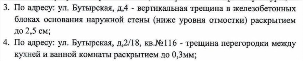 На самом деле, на тот момент квартир с трещинами было намного больше, но пострадавшие – пессимисты, на бумажную мороку по составлению актов и заключений время не тратили, а делали сами ремонты. И где-то были правы. Ещё в январе 2017 г. глава управы А.Р. Алисултанов писал нам, что ГБУ «Жилищник» рассматривает «вопрос о проведении полного технического осмотра», что «проектно-сметная документация для проведения конкурсных процедур и выполнения дальнейших работ по техническому осмотру» будет согласована с Советами домов. Где та документация? Где та процедура? Где тот осмотр? Да и где теперь тот Анзор Рашидович?