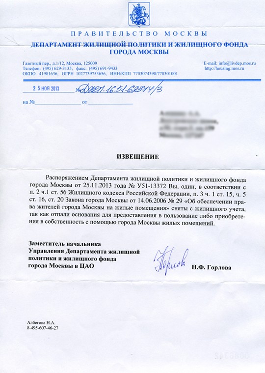 2 декабря Алешин получил письмо из департамента Москвы, в котором черным по белому написано, что 25 ноября он снят с очереди на получение специализированного жилья в связи с тем, что отпали основания. «Отпали основания» — это означает, что Алешин перестал быть инвалидом или уехал из Москвы...