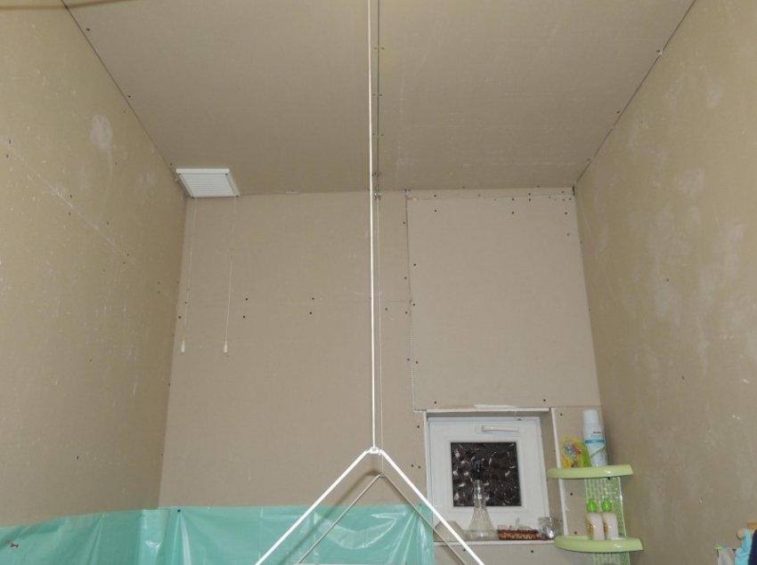 Ванную комнату, она же туалет, не фотографировали, ничего не поменялось, но и плесень не появилась, сами посмотрите. Обыкновенный гипсокартон стойко выдерживает бурные восторги нашего сына во время купания. На пол только положили линолеум и коврики, босиком не холодно ходить. Свисающая конструкция — икеевская сушилка под потолок, по-моему, отличное изобретение, экономящее место. Вообще, ИКЕА у нас по всему дому, дальше увидите. Да-да, мы — нищеброды, но это и так понятно.