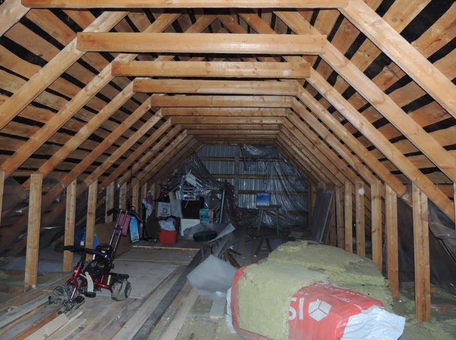 Это наш второй этаж, и наше разнообразное барахло. Высота потолка получится 2,5 метра. Что здесь будет, мы пока не придумали.