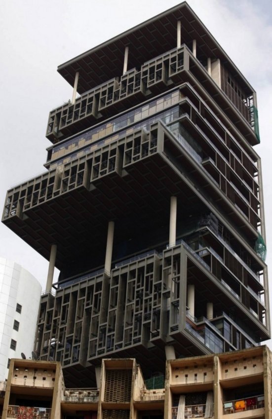 Необычное 27-этажное строение — собственность индийского мультимиллиардера Мукеша Амбани. Чтобы возвести его, Амбани потребовалось вложить около 5% своего состояния, которое оценивается в $27 млрд. В доме есть гараж на 168 мест, кинозал, оранжерея, сад, развлекательный центр, бассейн, зал для занятий йогой и даже комната с искусственным снегом. За всем этим (и не только) постоянно следит персонал численностью около 600-т человек.