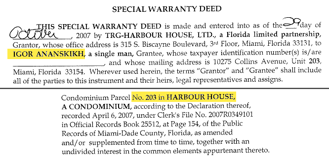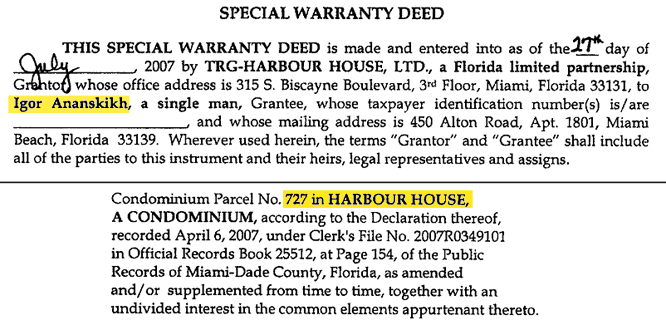 Через 4 дня, 7 марта 2008 года, Ананских покупает на SKY OBH LLC за $845,000 четвертую квартиру в Майами и обгоняет по количеству объектов депутата Пехтина.
