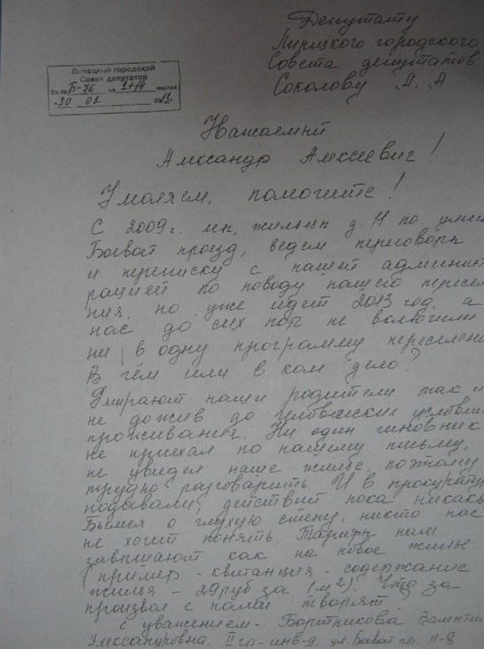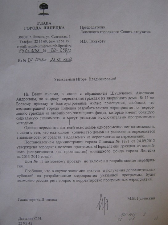 С 2008 года жители дома №11 и такого же дома-близнеца под номером 17 пишут жалобы во все инстанции — от президента страны и руководящей партии «Единая Россия» до липецкого губернатора и градоначальника, но на все на них получают стандартные ответы: «нет средств». Поэтому дом не попал ни в городскую программу переселения, принятую на 2009-2012 годы, ни в новую, разработанную на 2013-2015 года. Да-да, Михаил Гулевский так и написал: «Дом №11 по Боевому проезду не включен в разработанные мероприятия».