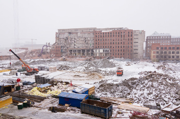 Административный корпус завода «Электросила» на Московском проспекте, 139, будет снесен до конца марта. Территория продолжает расчищаться под строительство жилого комплекса.