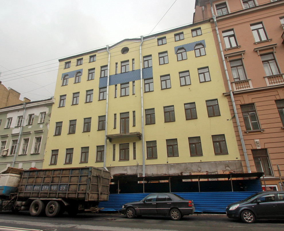 В связи с аварийностью дом частично разобрали. Застройщик надстроил мансарду, с фасада убрал лепнину, заменил декоративную плитку и изменил цвет фасада. После этого были убраны строительные леса, но дом так и не сдали. Уже около трех лет на объекте не видно никаких признаков проведения строительных работ, отсутствует также информационный щит.