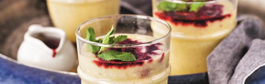 Затем разливаем по стаканам и добавляем пюре из ежевики. Украшаем листочками мяты.