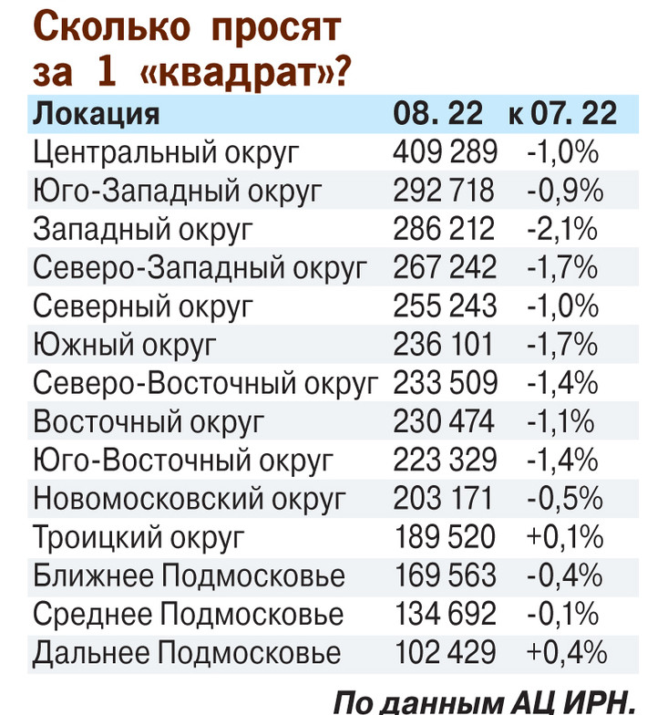 «За август средняя стоимость метра на вторичном рынке столицы сократилась на 1,1%, до 259,6 тыс. руб. И чем ближе к МКАД, тем быстрее падают цены в Новой Москве и Мособласти», — отметили аналитики АЦ ИРН. Если примыкающий к МКАД Новомосковский округ потерял 0,5% (см. таблицу), то Троицкий показал символический плюс (+0,1%).