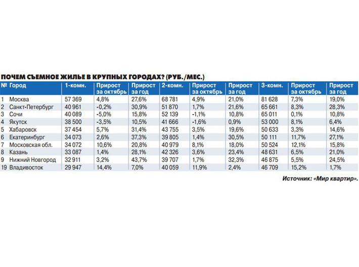 По оценке Луценко, однокомнатные квартиры подорожали в столице за октябрь на 4,8% (до 57 369 руб./мес.), двухкомнатные — на 4,9% (до 68 781 руб./мес.), трехкомнатные — на 7,3% (до 81 628 руб./мес.). За последние 12 месяцев средние ставки на 1-, 2- и 3-комнатные квартиры в столице подскочили на 27,6%, 21% и 19%, в Подмосковье — на 20,8%, 18% и 15,8%.