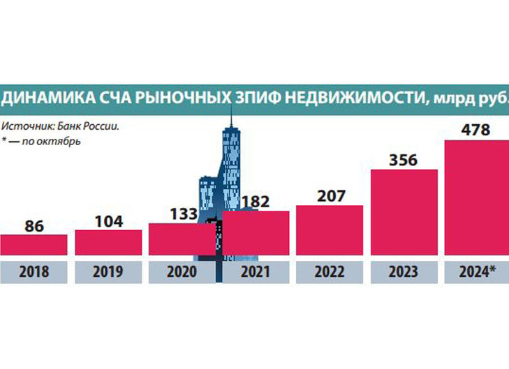 По оценке руководителя департамента рынков капитала и инвестиций IBC Real Estate Микаэла Казаряна, за 10 месяцев 2024 года стоимость чистых активов (СЧА) рыночных фондов недвижимости выросла на треть, до 478 млрд руб. В абсолютных значениях приток составил 119 млрд руб. Для сравнения, за весь 2023 год показатель вырос на 152 млрд руб.
