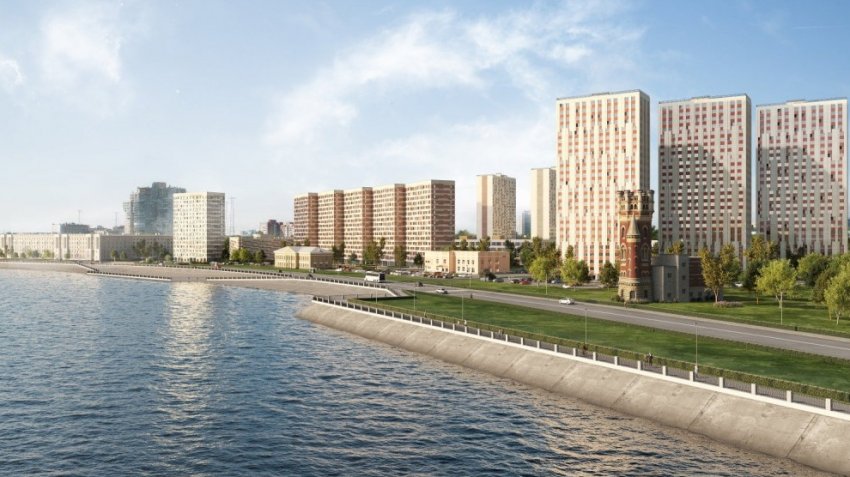 Группа «ЛСР» представила новую картинку будущего жилого комплекса на углу проспекта Большевиков и Октябрьской набережной. На ней видно, как на фоне «муравейника» потеряется старинная водонапорная башня.