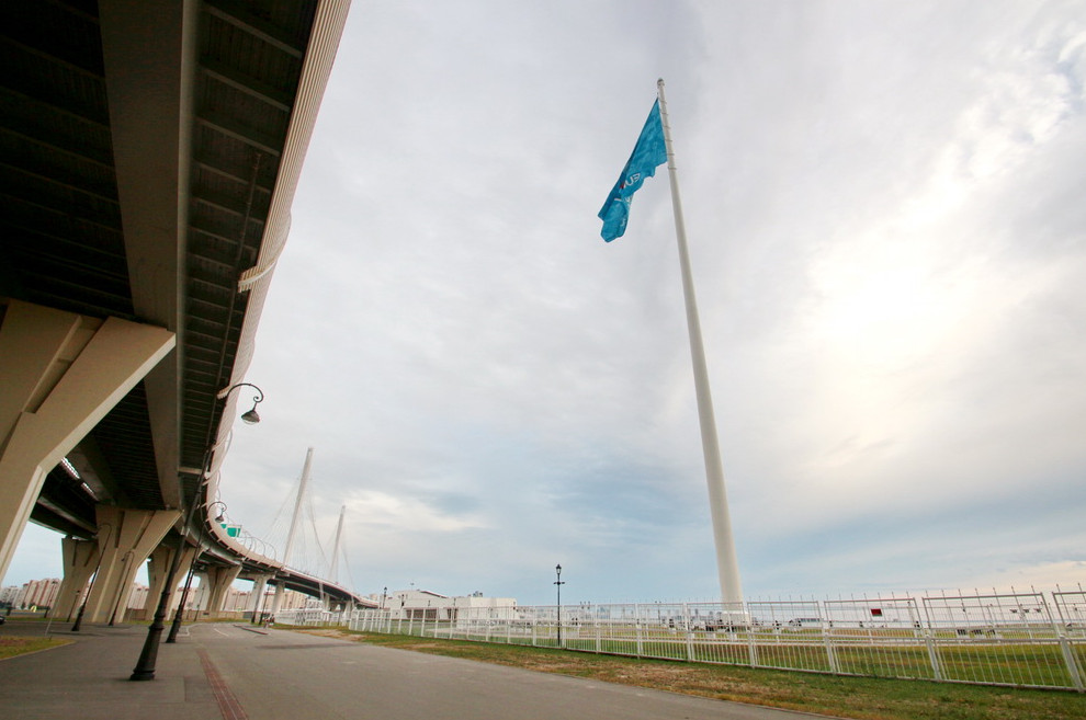 Одновременно сдали 105-метровый флагшток. Его установили год назад, тогда же повесили флаг футбольного клуба «Зенит» размером 20×30 метров, но только нынешней весной эксплуатацию сооружения узаконили.