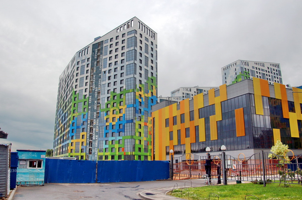 На улице Федора Котанова на Мясокомбинате завершилось строительство второй очереди «муравейника» от Seven Suns. Новые дома, как и предыдущие, имеют разноцветные фасады.