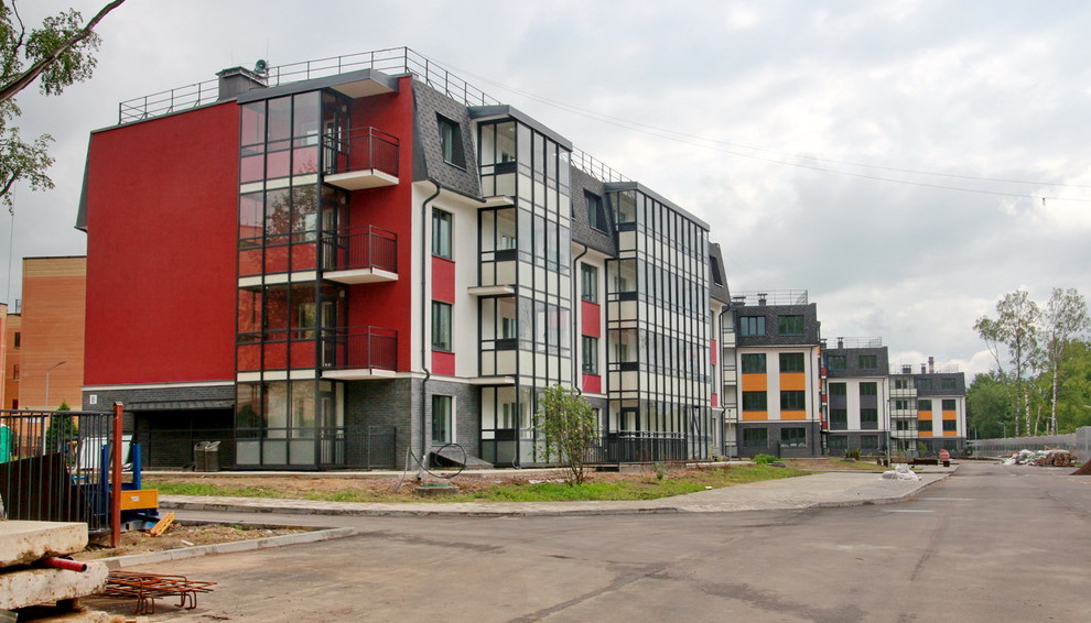 В соответствии с проектом, выполненным ООО «Специальное проектно-конструкторское бюро», по участку расставили семь однотипных жилых домов. Они выполнены четырехэтажными, а фасады разноцветными. Поскольку здания расположились вдоль железной дороги, от нее отгородились высоким шумозащитным экраном.
