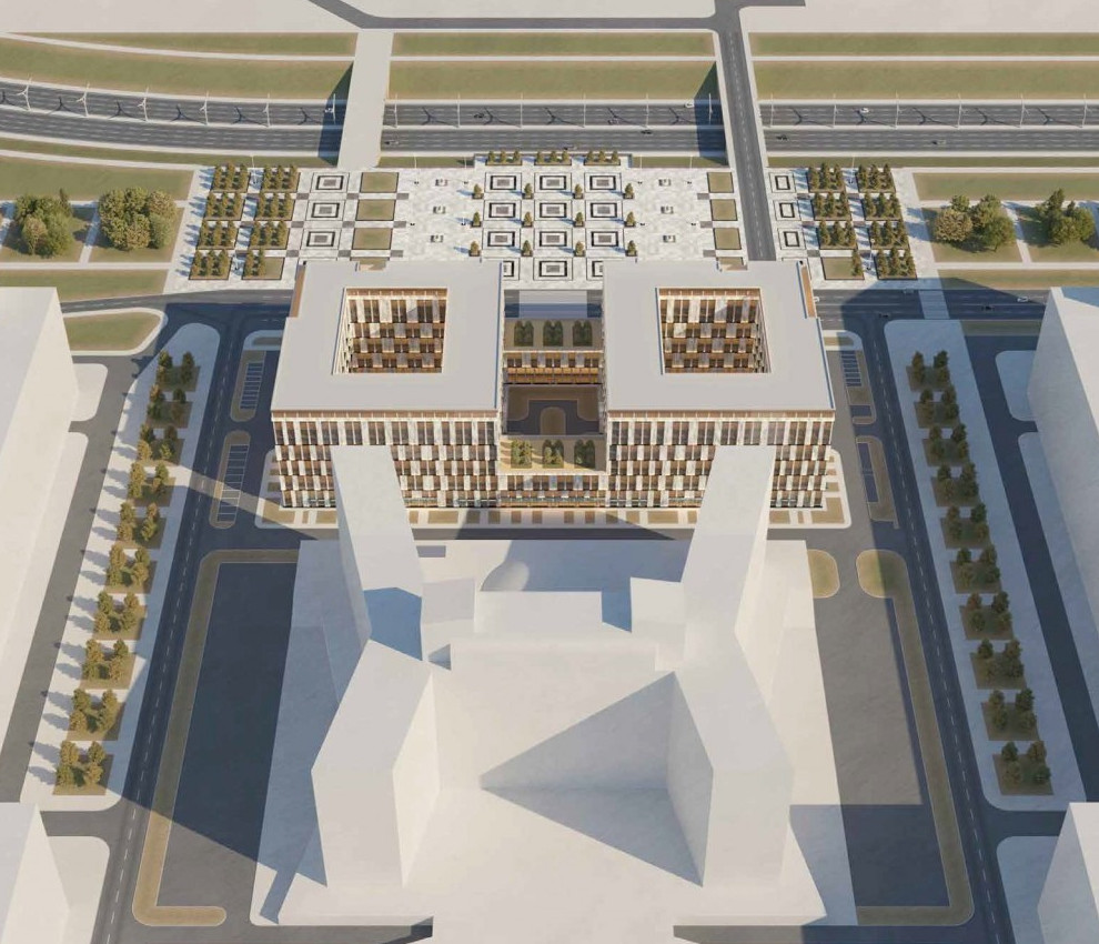 Но оказалось, что вариант «Стройэксперта» не финальный. Сегодня новую работу представили на градсовете. Ее разработало ООО «Архитектурная мастерская Столярчука». Гостиница будет состоять из двух симметричных 12-этажных коробок с почти квадратным двором-колодцем. Между коробками организуют два четырехэтажных перехода. Фасады сделаны в «стиле» хаотизм.