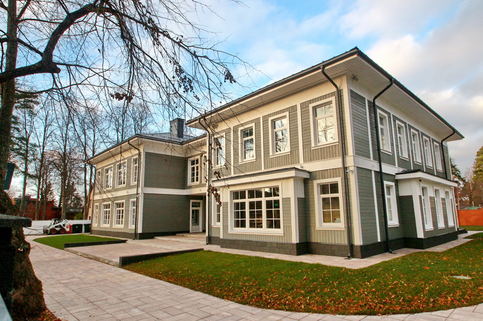 На Лиственной улице в Сестрорецке построили частную школу. Фасады имитируют деревянное исполнение, хотя здание сделано из газобетонных блоков.