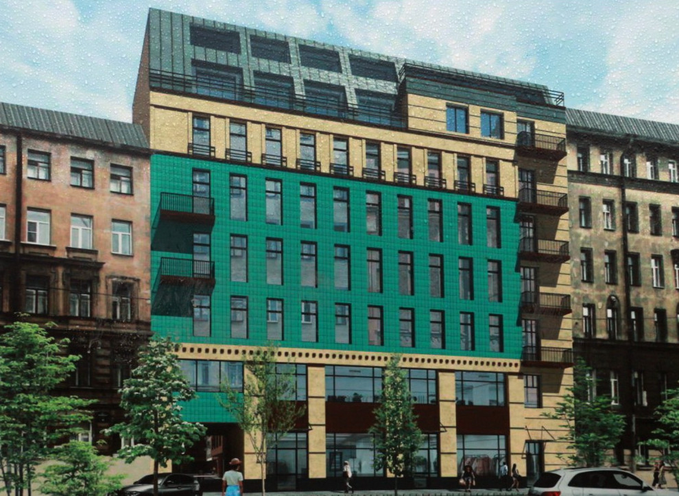 Представлен проспект жилого дома, который начали строить на 15-й линии Васильевского острова, 84. Значительная часть стен будет выкрашена в зеленый цвет.