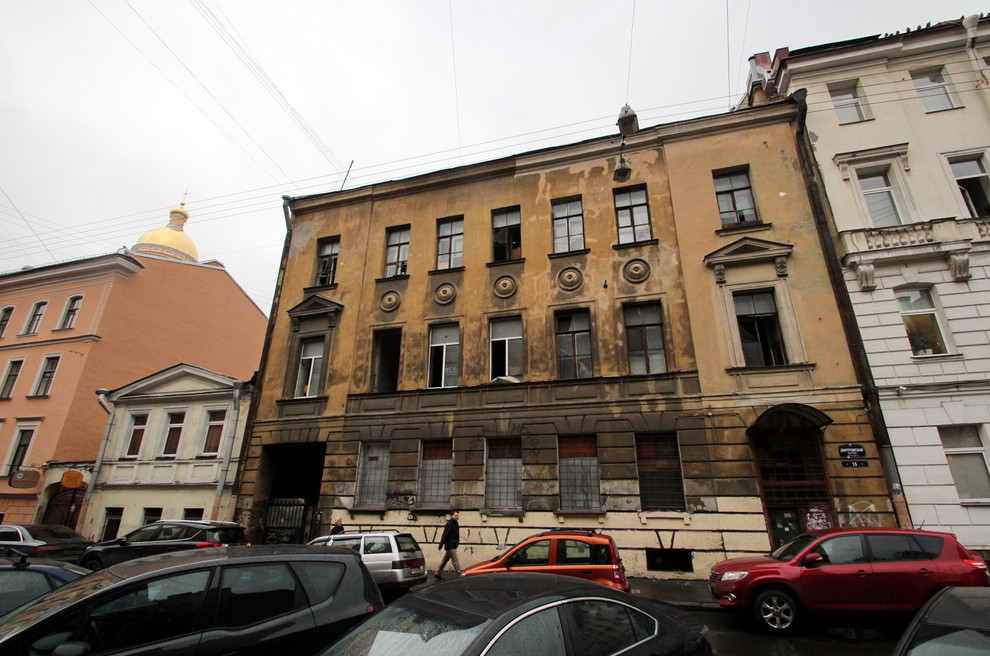 Трехэтажный доходный дом был построен в 1853 году. В 1944-м его фасад переделали в сталинской стилистике по проекту Нины Тлущевской. Дом не признан памятником, но охраняется как историческое здание. В 2000-х объект стал аварийным, его расселили.