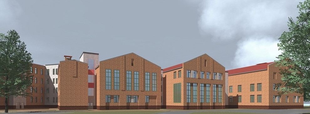 В исполнении ОАО «ЛенНИИпроект» получилась четырехэтажка сложной формы, облицованная красным кирпичом. Некоторые крылья получат треугольное завершение. Учиться тут смогут одновременно 825 человек.