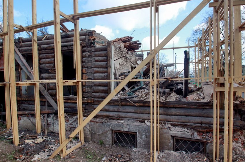 В начале апреля на фасадах появились леса. С них рабочие сняли деревянную отделку. А теперь приступили к демонтажу здания.