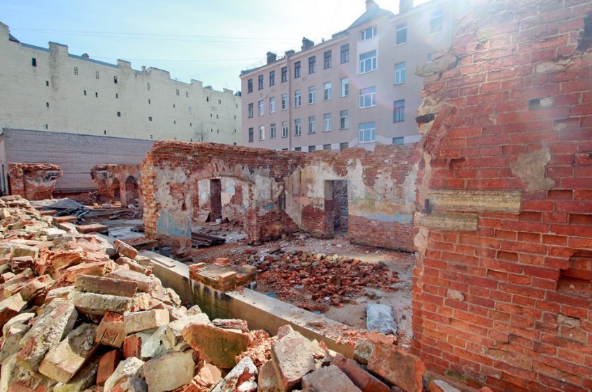 На реконструкцию руинированного дворового флигеля на набережной реки Фонтанки, 89, литера В, выдали разрешение. После прошлогоднего демонтажа от двухэтажного здания оставили фрагменты стен первого этажа.