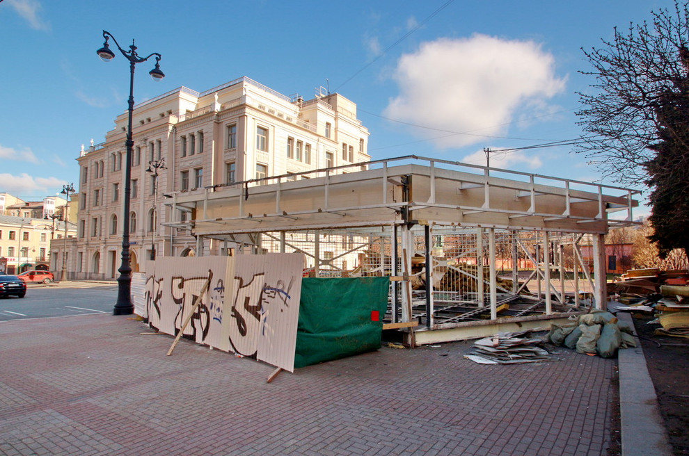 На Греческой площади разбирают временное здание касс БКЗ «Октябрьский» - «Свежие новости строительства»
