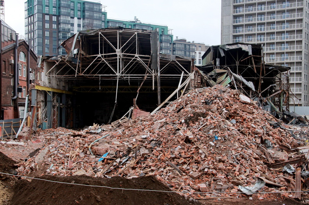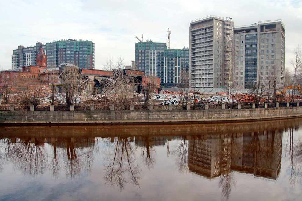На проспекте Шаумяна возле моста Шаумяна через Охту сносят дореволюционное производственное здание. На его месте группа AAG запланировала возвести темнокирпичный жилой дом.