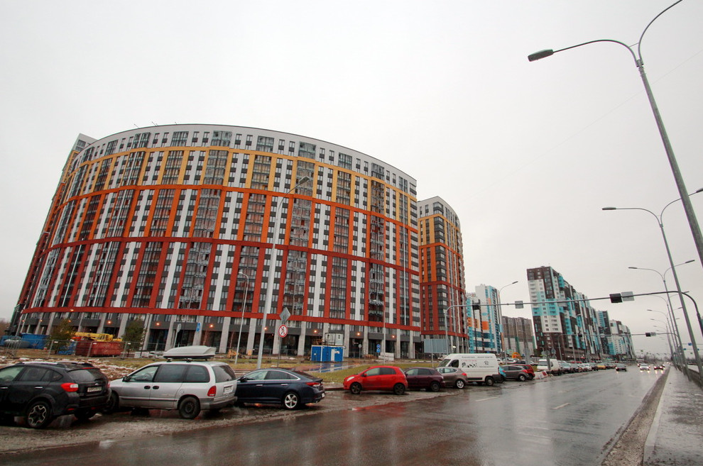 На Комендантском проспекте в Каменке завершилось строительство второго жилого дома от группы RBI в форме улыбки. Он вышел к углу с Глухарской улицей.