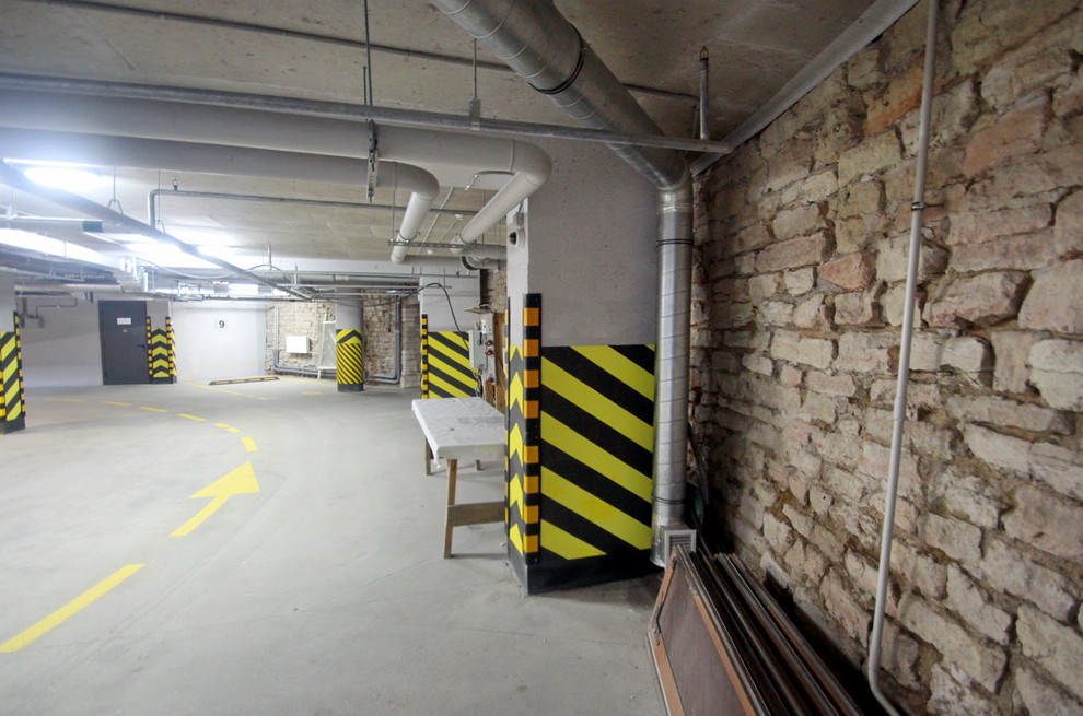 Нынешней осенью паркинг был введен в эксплуатацию, рассказал «Канонеру» представитель RBI. Он рассчитан на 89 мест. Подниматься на все ярусы на машине можно только по системе пандусов, а вот для пешеходов предусмотрен лифт.