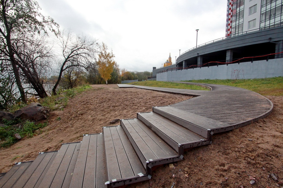 В рамках проекта был благоустроен берег Невы. Там появились «прогулочная дорожка и песчаный спуск к воде, с которого теперь можно любоваться водной гладью реки», уточнили сегодня в Setl Group. Дорожки и площадка сделаны из террасной доски.