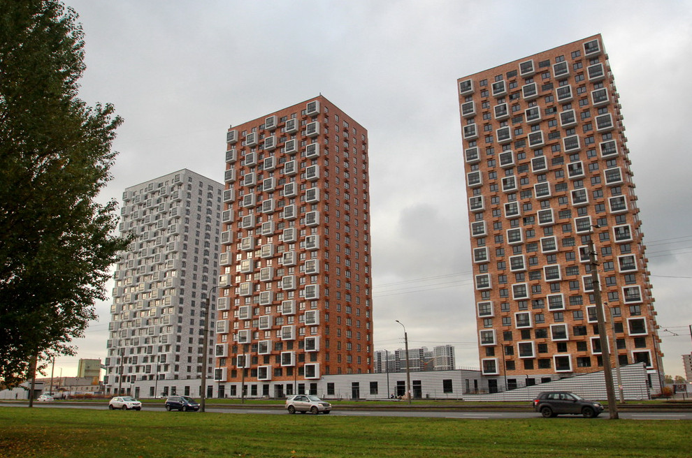 На Дальневосточном проспекте завершилось строительство жилого дома в промзоне южнее улицы Дыбенко. Он выполнен в виде трех 24-этажных коробок с квадратными остекленными балконами.