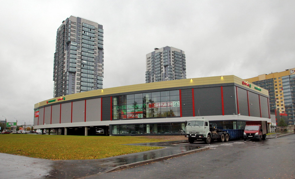 Разрешение на строительство «объекта бытового обслуживания» было выдано осенью 2017 года. Его оформило ООО «Северная столица», связанное с ООО «ТД „Интерторг“» (помимо прочего, развивает сеть Spar). Двухэтажное здание с элементами «стиля» стаканизм было размещено возле Кушелевской дороги в квартале-«муравейнике» на месте бывшего военного городка.