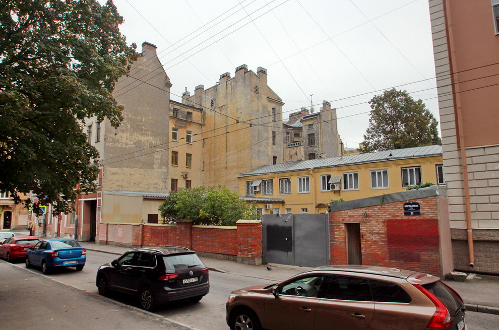 Т-образный земельный участок на Бармалеевой улице, 22, выходит не только на Бармалееву, но и на параллельную Подрезову улицу. На нем стоят два здания, одно из них — под литерой Б — числится дореволюционным. Сейчас это здание имеет формы буквы Г: «ножкой» оно выходит к Подрезовой улице, а основная часть находится во дворе.