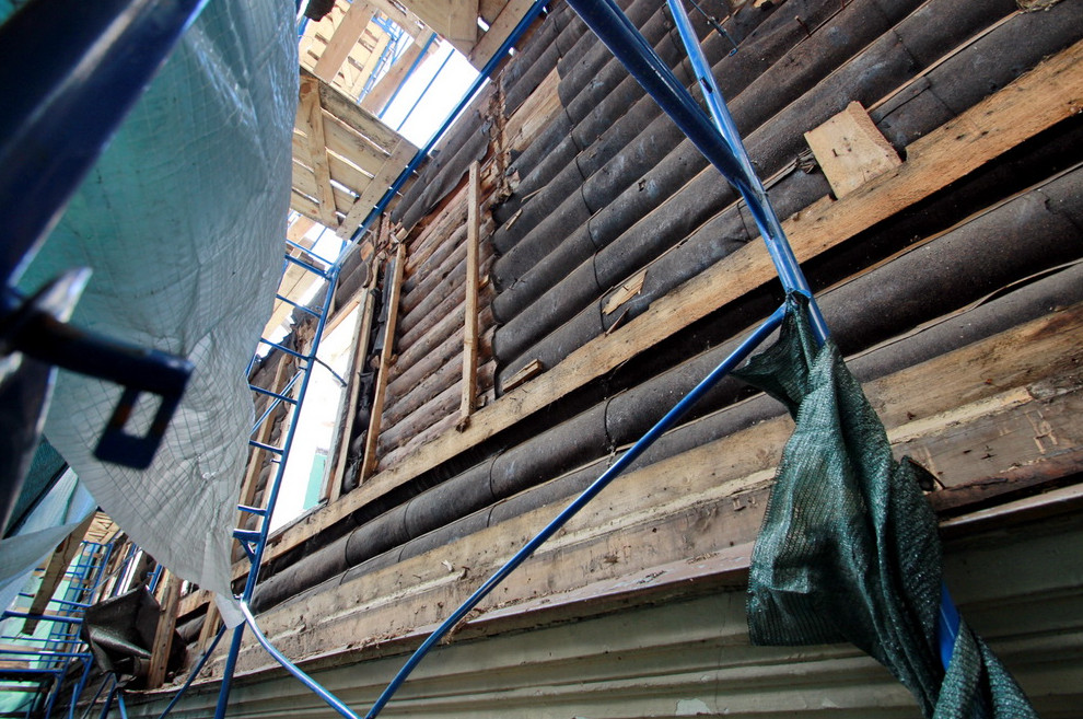 Резной флигель дома Гербольдта на Санкт-Петербургском проспекте, 25а, в Петергофе частично разобрали. Один из рабочих заверил корреспондента «Канонера», что это — «реставрация».