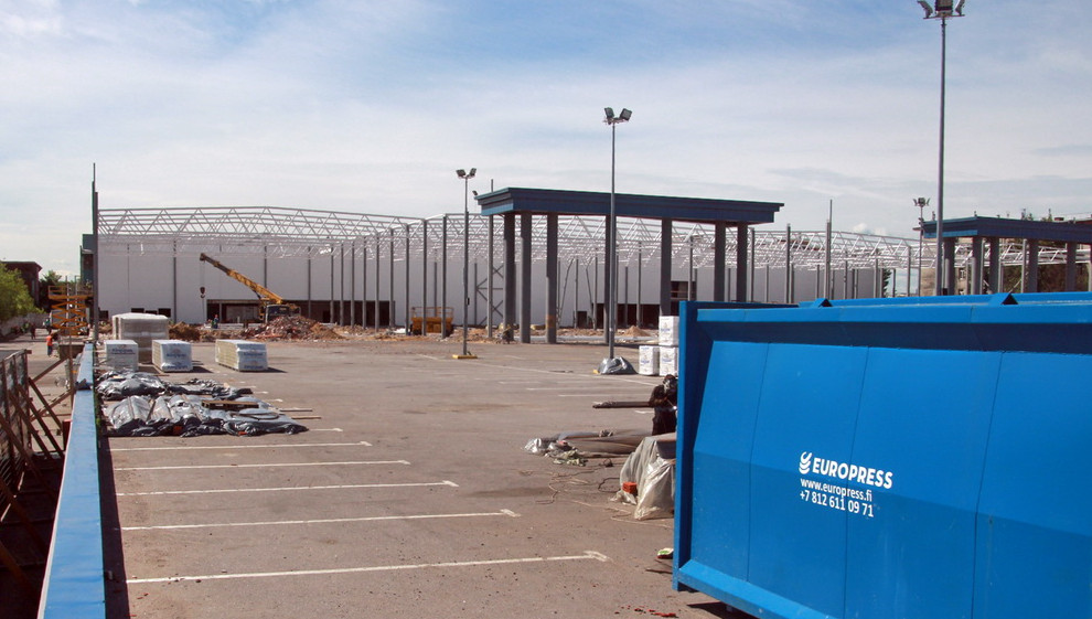 Здание гипермаркета «Лента» на набережной Обводного канала, 118, корпус 7, начали строить заново после прошлогоднего пожара. От старого сооружения оставили два портика и административный корпус во дворе.