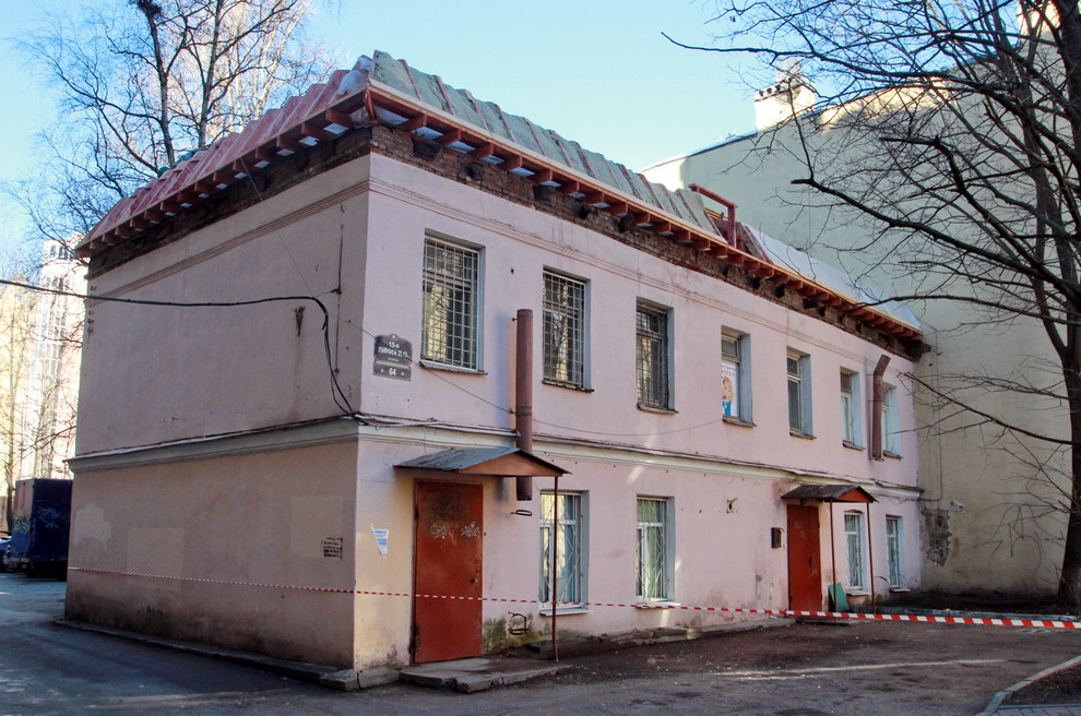 Дореволюционный дворовый флигель на 15-й линией Васильевского острова, 64, — между линией и Донской улицей — надстраивают третьим этажом. Вероятно, внутри, как и прежде, будут офисы. Одноэтажное здание было построено в 1854 году как службы при деревянном особняке, выходившем на 15-ю линию. В 1879-м