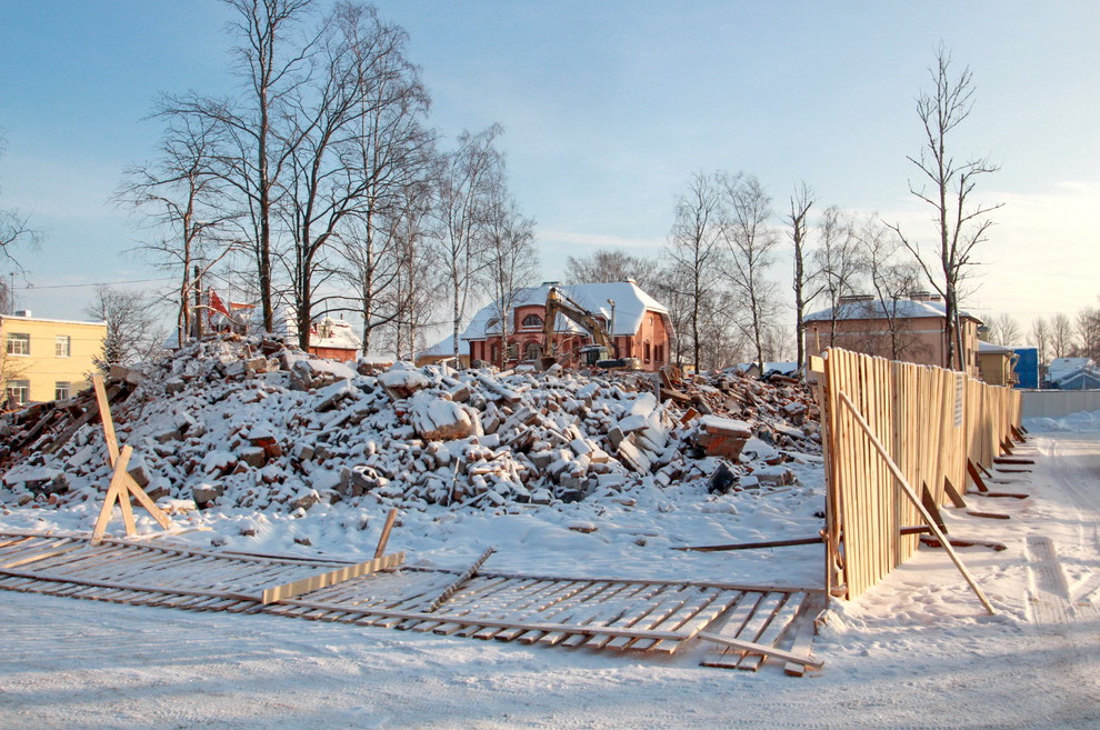 В Стрельне сносят расселенное общежитие-«сталинка» на Нагорной улице, 17, корпус 1. Заказчиком выступает предприятие, входящее в состав Министерства обороны. Двухэтажное общежитие было построено в 1952 году в сталинской стилистике. В последнее время оно стояло заброшенным и затянутым сеткой. Как