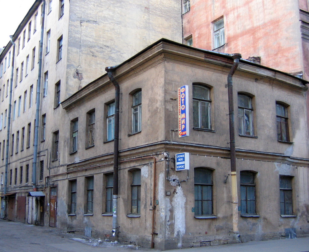 Двухэтажный флигель, примкнувший к соседнему брандмауэру, был построен до революции, во второй половине XIX века. В последнее время он стоял заброшенным. На его фасадах были заметны следы сильной деформации. У оконных проемов они были закамуфлированы укладкой дополнительных кирпичей.