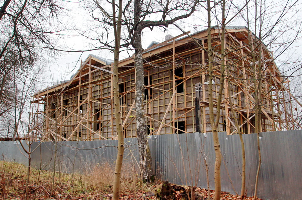 В Фабричном Поселке, 4, в Красном Селе воссоздают снесенный памятник архитектуры — деревянный жилой дом при Красносельской писчебумажной фабрике. Причем стены собираются из дерева, а не из бетона или кирпича.