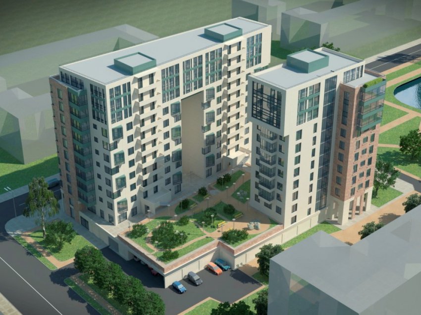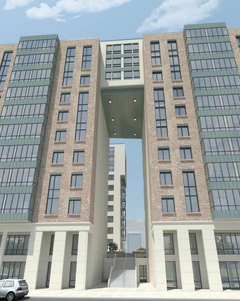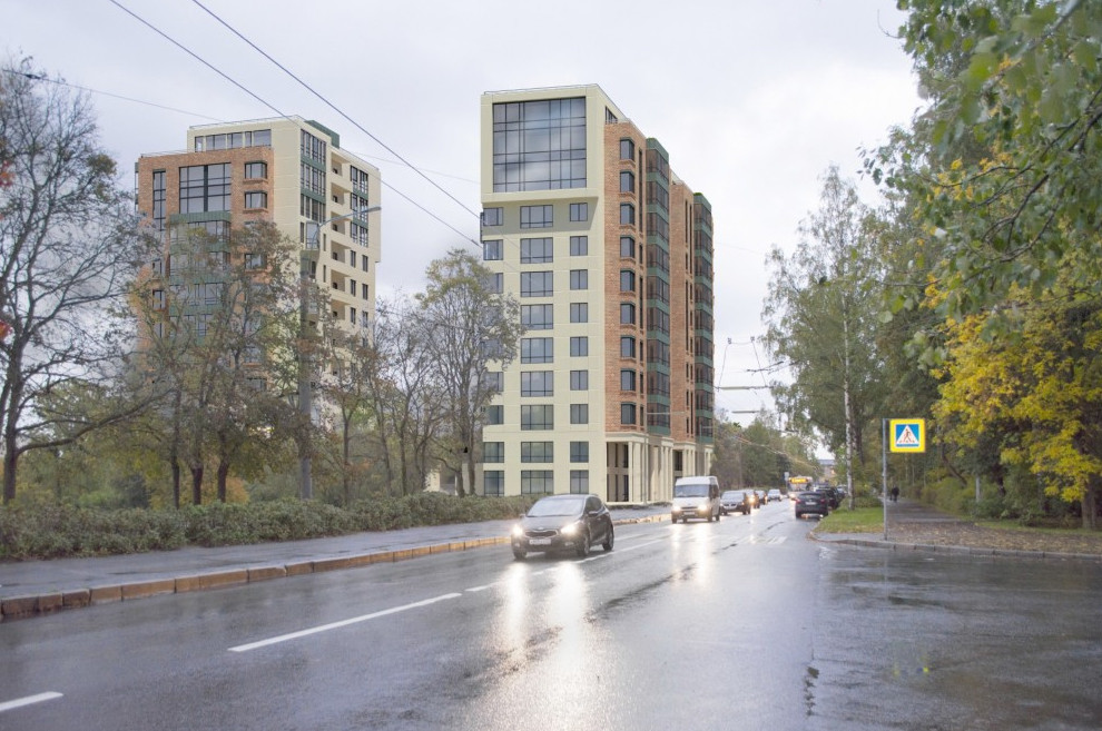 Проект нового жилого дома на этом месте разработало ООО «Лявданский и Герасимов. Архитектурная мастерская». Причем заказчиком у фирмы был не «Рант», а Физико-технический институт. В исполнении мастерской получились два 12-этажных корпуса, ориентированных параллельно улице и поставленных на общий стилобат.