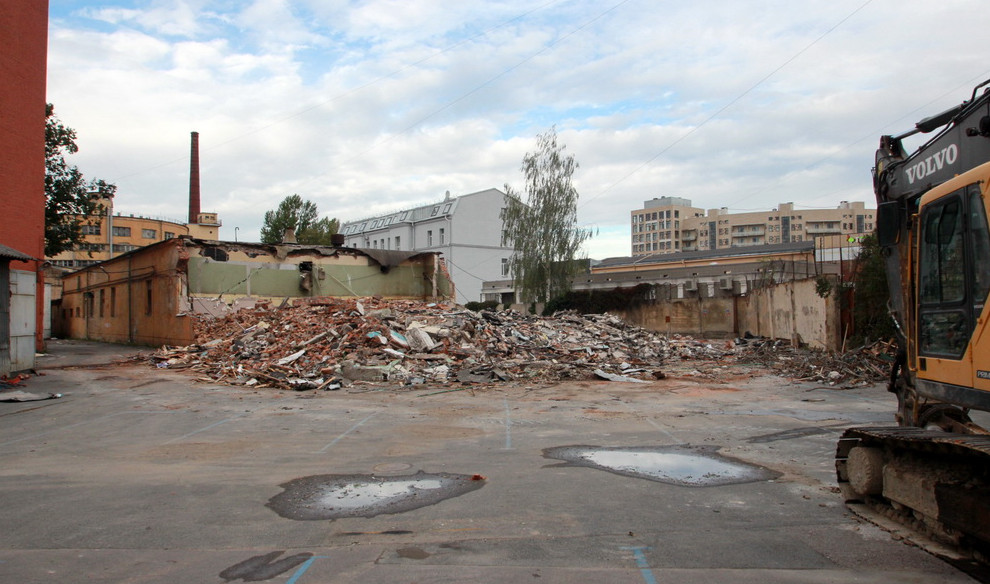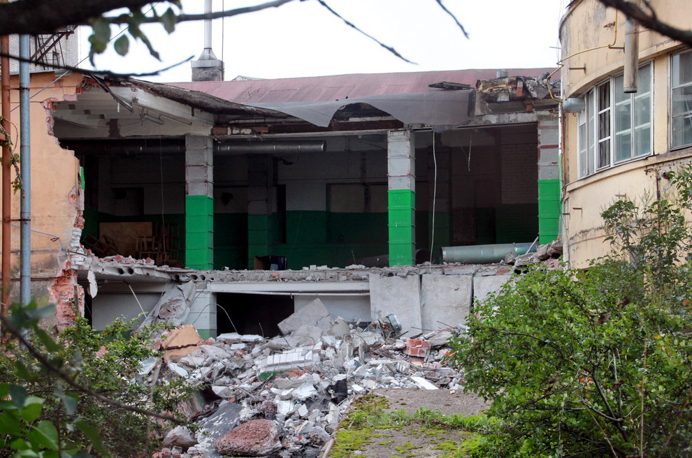 На днях начался снос пристроек. По данным «Канонера», работы проводит ООО «Алюр», которое победило в корпоративном тендере. А сегодня Всероссийское общество охраны памятников распространило заявление, в котором сообщило, что «несколько недель назад в КГИОП подано от авторитетнейшей международной организации в области наследия архитектуры XX века DOCOMOMO заявление о выявлении еще части комплекса». Речь о признании этой части выявленным памятником архитектуры. Градозащитники в своем релизе вопрошают: «Что же будут оценивать эксперты, если заявленный объект сейчас рушит экскаватор?» Почему DOCOMOMO подало заявление «несколько недель назад», а не в 2012 году, когда стало известно о проекте, ВООПИиК не уточняет.
