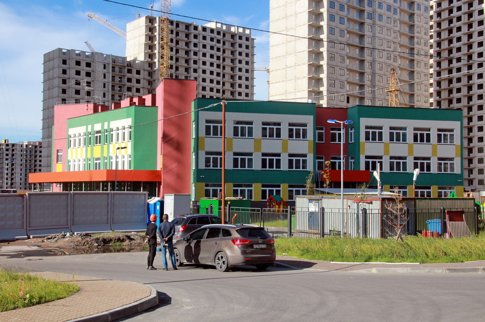 На Дальневосточном проспекте завершилось возведение первого жилого дома в рамках двухквартального проекта от ЛСР. Заодно сдали детский сад во дворе, стоящий посреди шумной стройки.
